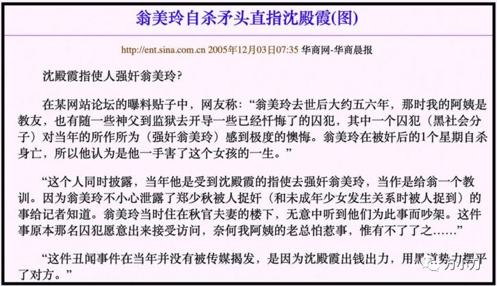 就拿最骇人听闻的那个来说:囚犯忏悔,说受沈殿霞指使强奸翁美玲,导致她一周后自杀……沈殿霞固然霸道,有没有那么小肚鸡肠和卑鄙下作,姑且不论。